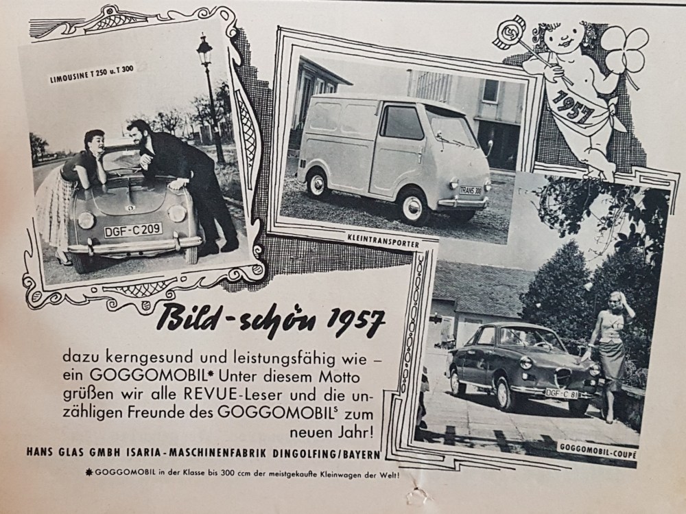 Em dezembro de 1956, a Goggomobil anunciava seus modelos para o ano de 1957 na revista REVUE, veiculada na Alemanha.
