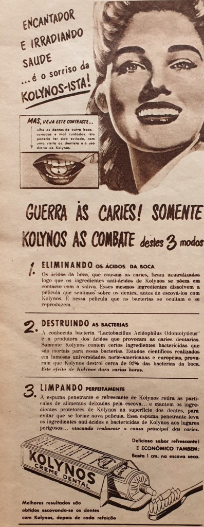 Criada em 1908, nos Estados Unidos, pelo dentista Neal Jenkins, a Kolynos começou sua comercialização no Brasil em 1917 e anunciava seu produto com o slogan “limpa os dentes e a escovinha também”.