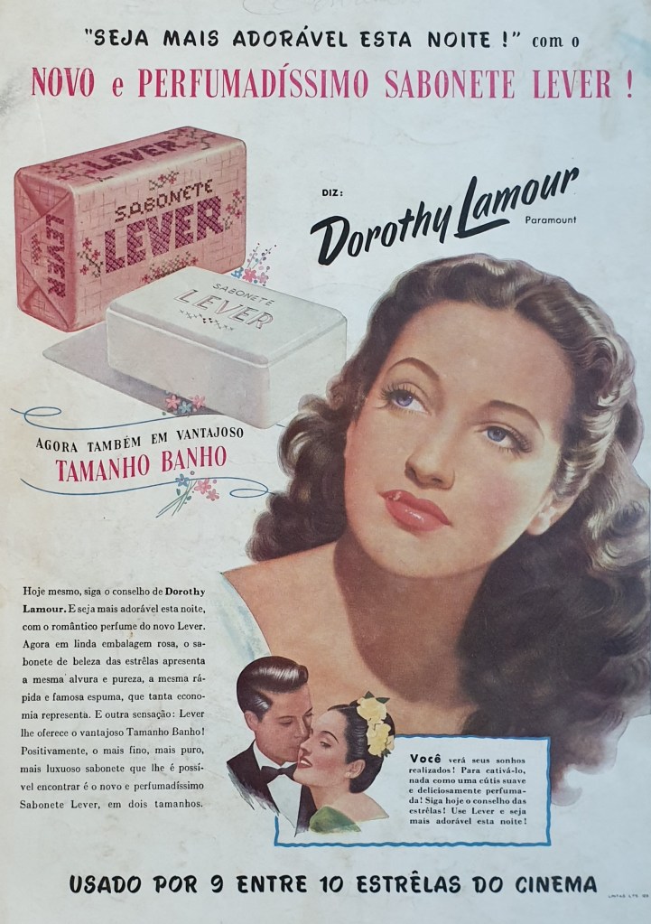 Essa propaganda, com a atriz Dorothy Lamour, foi veiculada na revista O Cruzeiro em setembro de 1950.